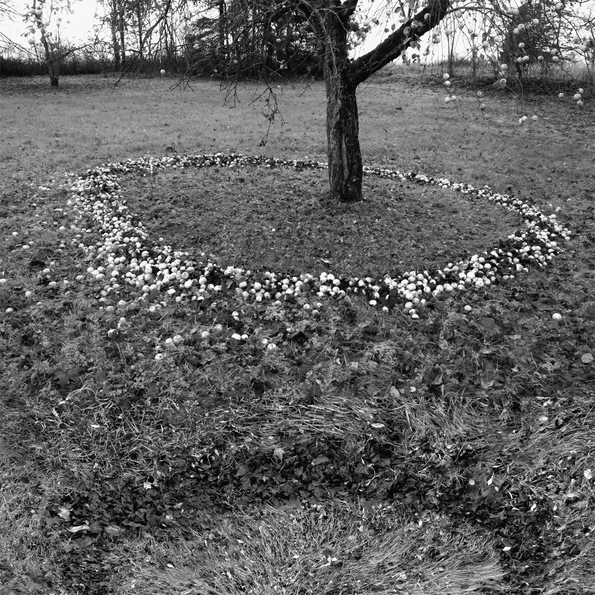 As a habitat, Rae county is largely a garden town, where newer and older private houses are accompanied by more and less kept gardens. The natural foes of all gardentowners - dropped apples and autumn leaves have been arranged by Kaarnamo into monumental figures that resemble secret landmarks of unknown civilizations. Even the details of mundane housings and industrial-complexes have been elevated to symbols, perhaps even artefacts. Kaarnamo uses all of this to create a minimalistic space that provokes behaviour out of the ordinary. The artist beckons the lookers attention to the ceiling and other spots usually not looked at. She doesn’t let the audience’s attention to fade and brings mundane details into the spotlight, in a carefully planned manner, making them art.